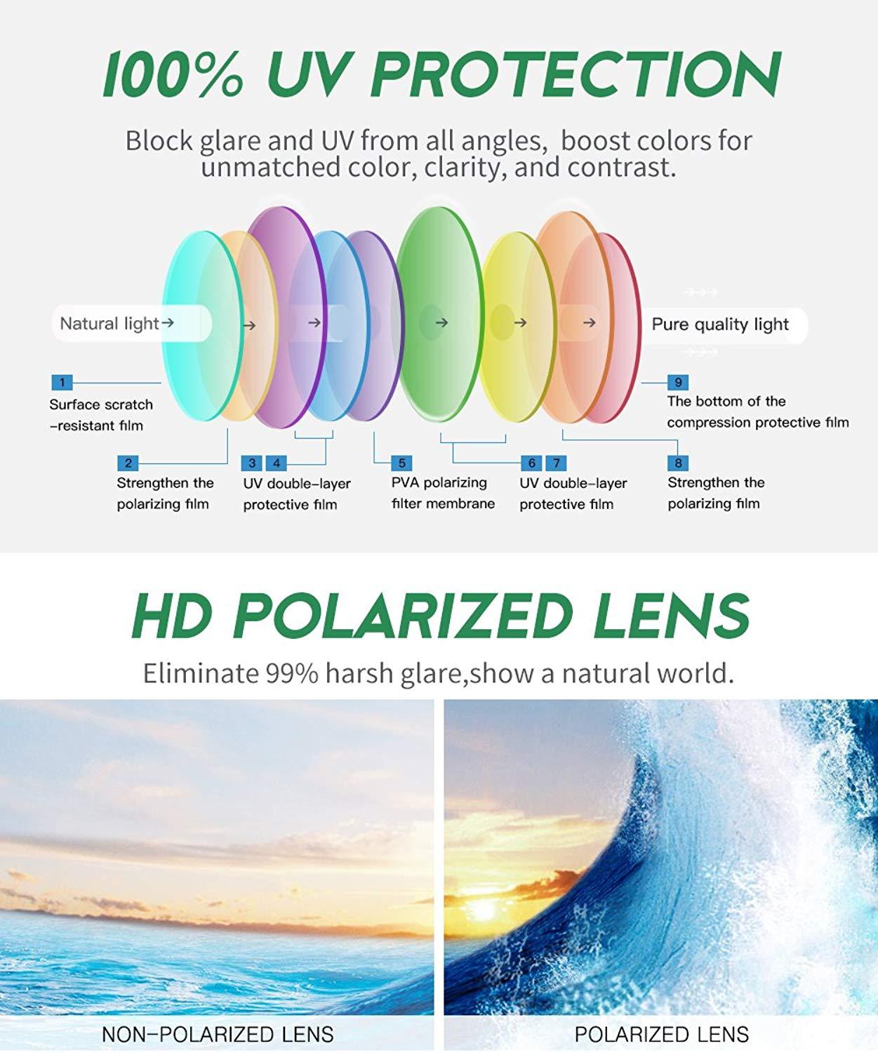 - Polarized UV 400 Protection: Blocks 99-100% of harmful UVA and UVB rays, eliminating glare for safer vision